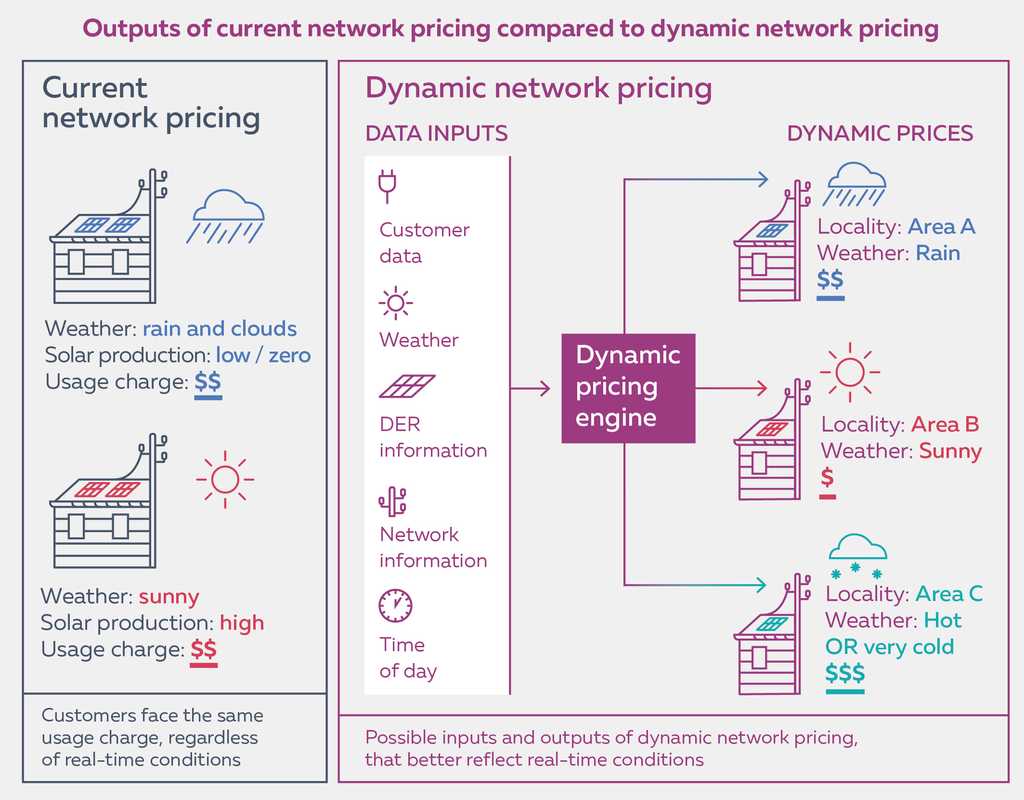 Dynamic network prices, which is a flexible price structure that changes frequently to reflect real-time conditions. For instance, on a sunny day, the import cost may be cheaper in the mid-afternoon to incentivise battery or electric vehicle charging from the excess solar energy produced, whereas on a cloudy day the import cost may be cheaper in the morning to encourage overnight charging (see figure below).